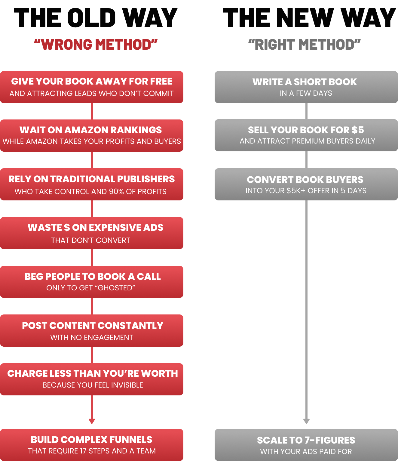 The 7-Figure book Method is different because it actually scales a business in a way that makes sense. You write a short expertise book, sell 25 to 50 copies daily and then convert the book buyers into clients within days.